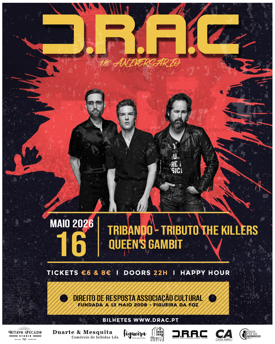 A DRAC – Direito de Resposta Associação Cultural atinge a maioridade e a festa vai ser histórica! No dia 16 de Maio, abrimos as portas para celebrar 18 anos de música, arte e convívio na Figueira da Foz. 🥂✨